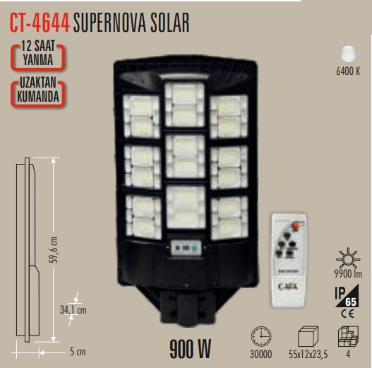 Cata CT-4644 Solar Sokak Lambası 900W IP65 Uzaktan Kumandalı Güneş Enerjili Beyaz Işık 6400K