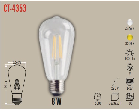 CT-4353 8W EDİSON LED AMPUL GÜNIŞIĞI ST-64 CATA isimli ürünümüz şu an için stoklarımızda mevcut değil. Stoklara giriş tarihi hakkında bilgi almak için İletişim Bilgileri sayfamızdaki form aracılığı ile bizlere ulaşabilir ve bilgi alabilirsiniz.