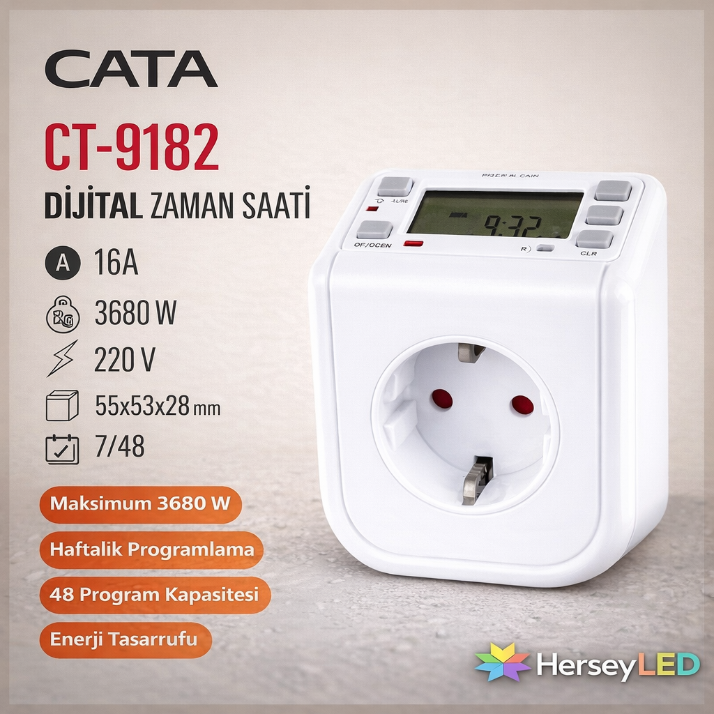 Elektriği siz değil, zaman yönetsin! CATA CT-9182 Dijital Zaman Saati, cihazlarınızı belirlediğiniz saatlerde otomatik açıp kapatarak hem konfor hem de enerji tasarrufu sağlar.