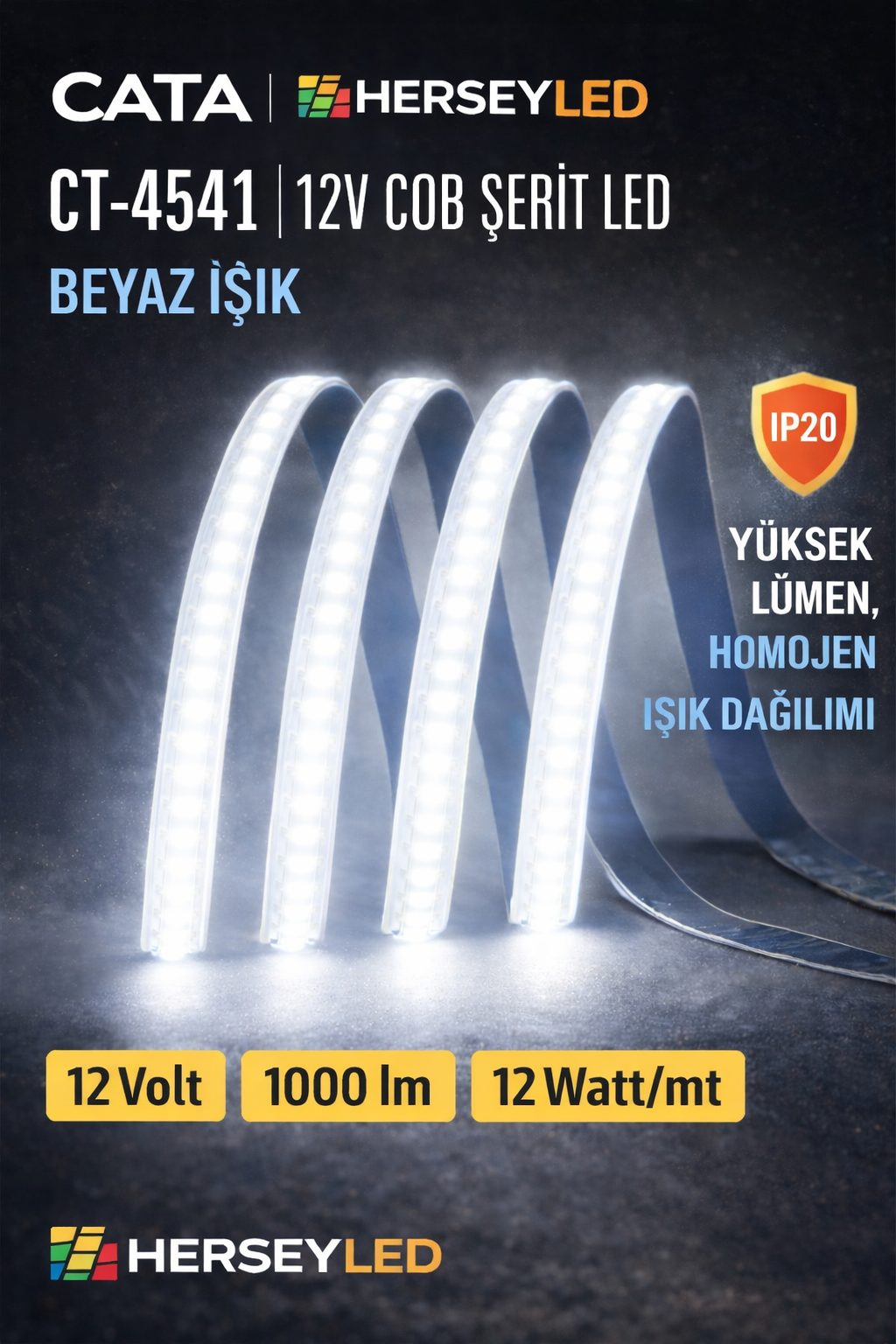 CATA (CT-4541) 12V COB ŞERİT LED BEYAZ IŞIK 6500K (5 Metre Paket) YÜKSEK LÜMEN