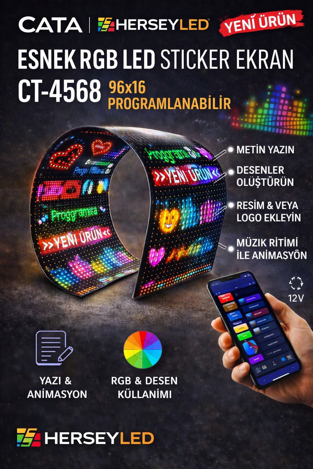 CATA (CT-4568) ESNEK RGB LED STİCKER EKRAN 96X16cm PROGRAMLANABİLİR