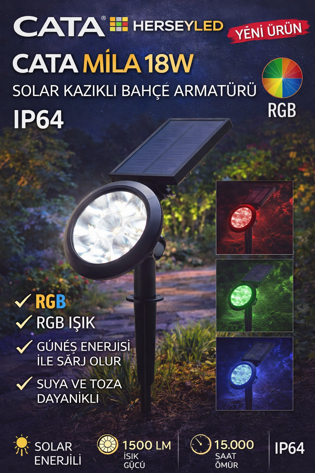 CATA (CT-7321) MİLA 18W SOLAR KAZIKLI BAHÇE ARMATÜRÜ RGB IP64