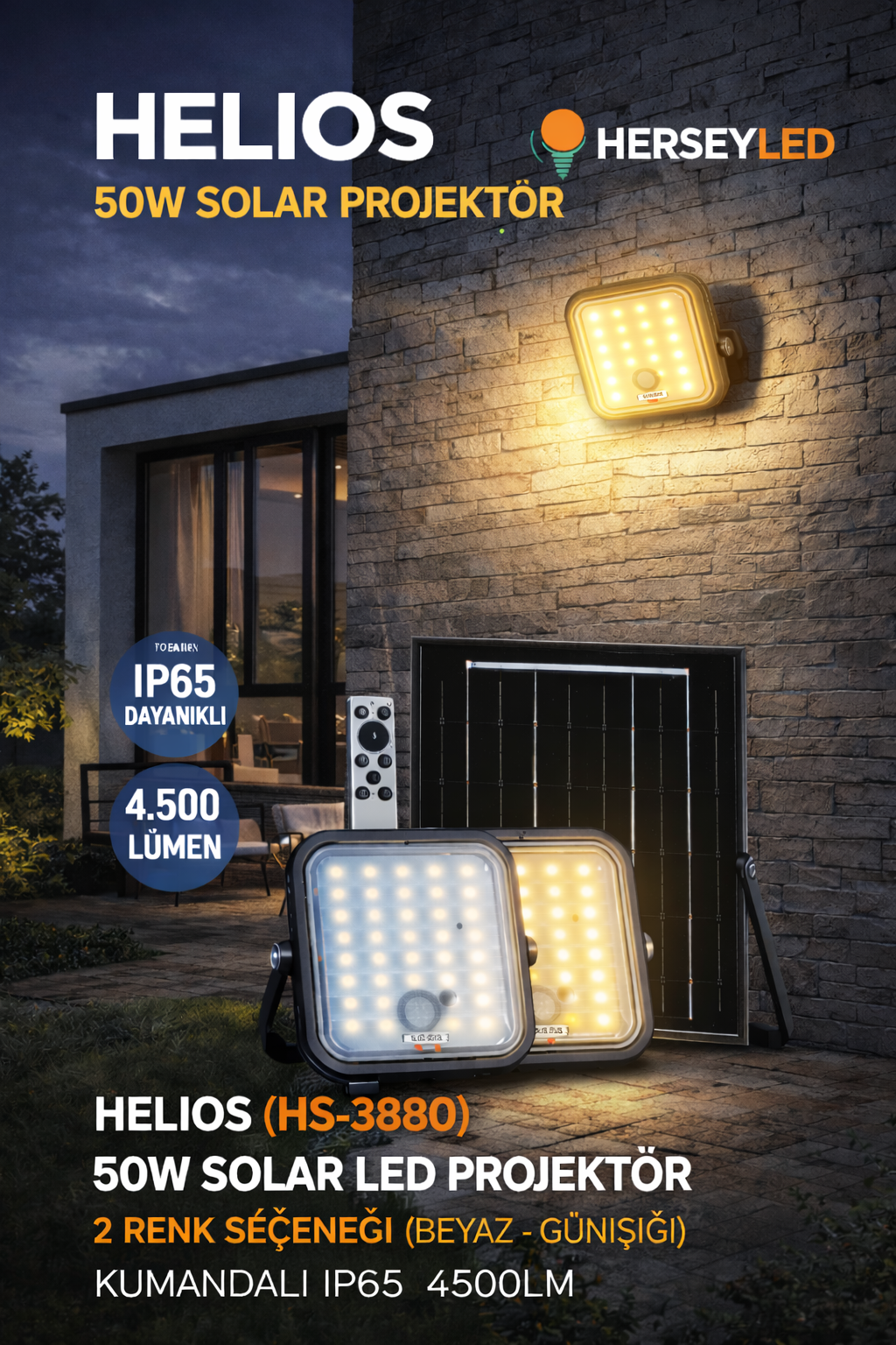 HELİOS (HS-3880) 50W SOLAR LED PROJEKTÖR 2 RENK SEÇENEĞİ ( BEYAZ - GÜNIŞIĞI ) KUMANDALI IP65 4500LM
