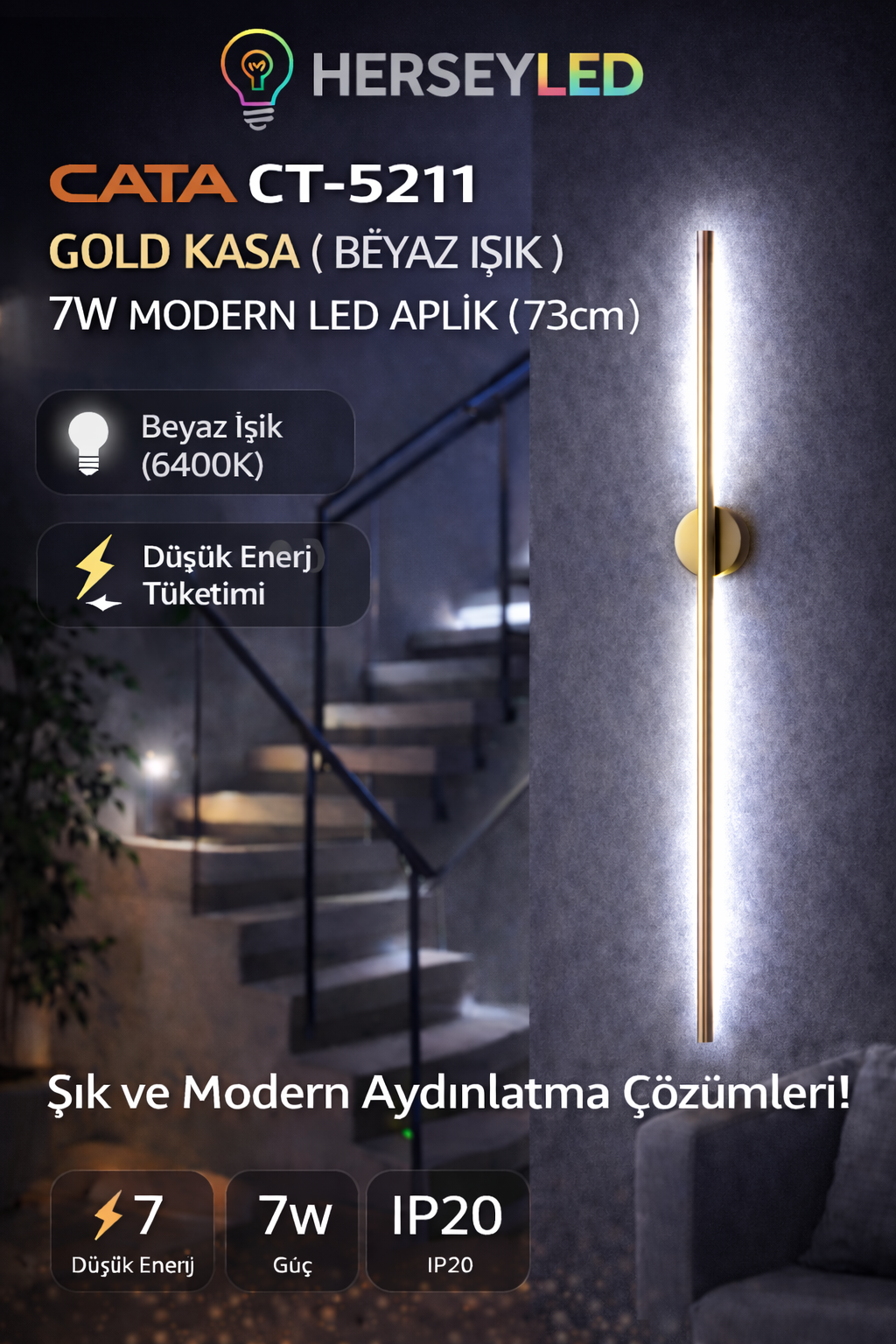CATA (CT-5211) GOLD KASA ( BEYAZ IŞIK ) 7W MODERN LED APLİK ( 73cm )