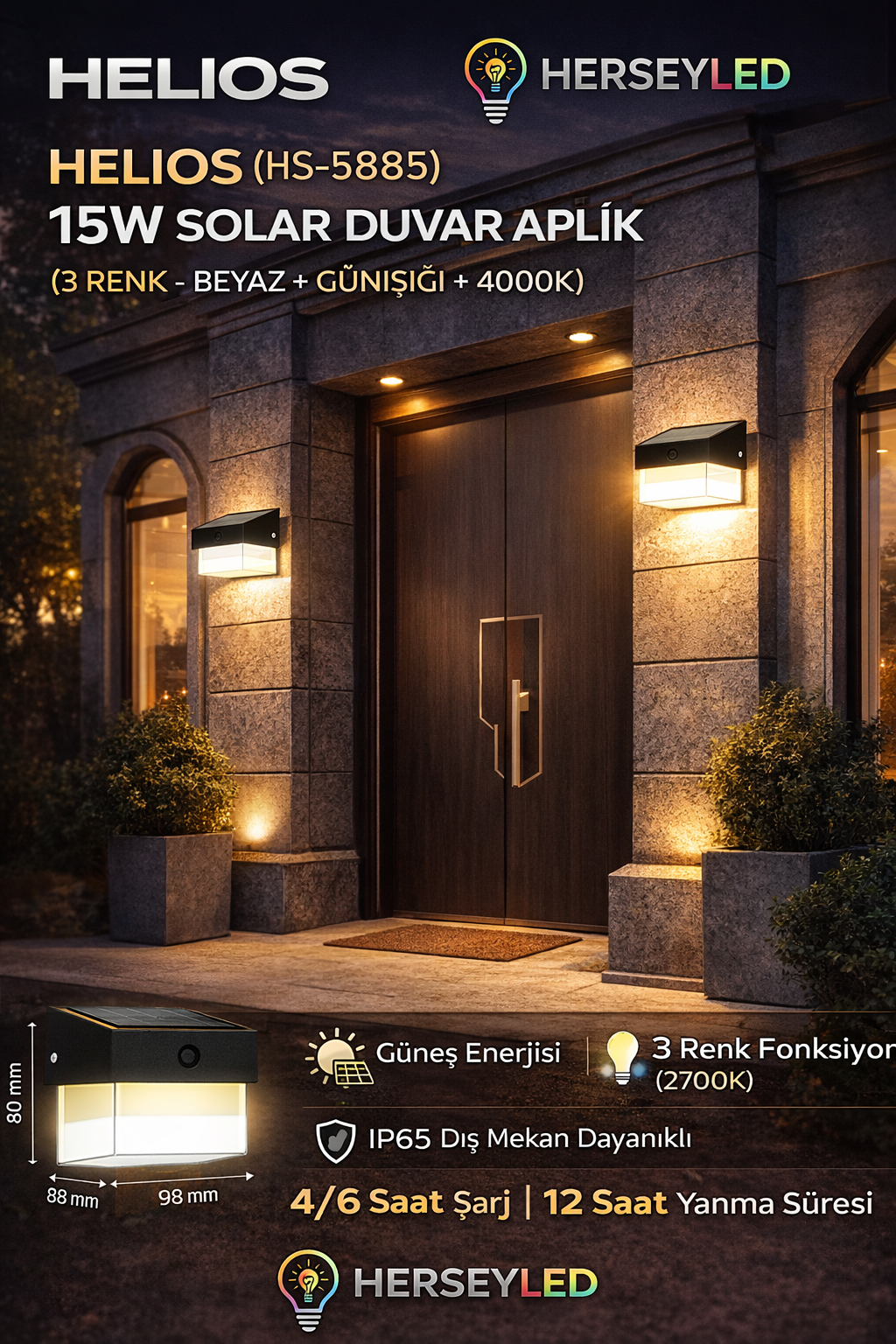 HELİOS (HS-5885) 15W SOLAR DUVAR APLİK ( 3 RENK - BEYAZ + GÜNIŞIĞI + 4000K )
