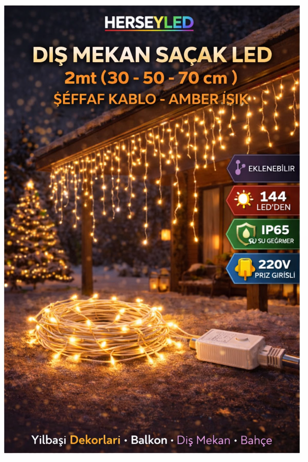 SAÇAK LED AMBER IŞIK ( DIŞ MEKAN IP65 ) 2MT ( 30-50-70CM) EKLENEBİLİR ŞEFFAF KABLOLU YILBAŞI LED IŞIK 220V (ALS-1441AS )