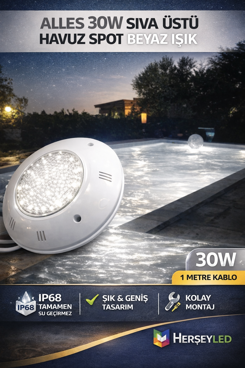ALLES 30W SIVA ÜSTÜ HAVUZ SPOT BEYAZ IŞIK ( ALS-30HB )