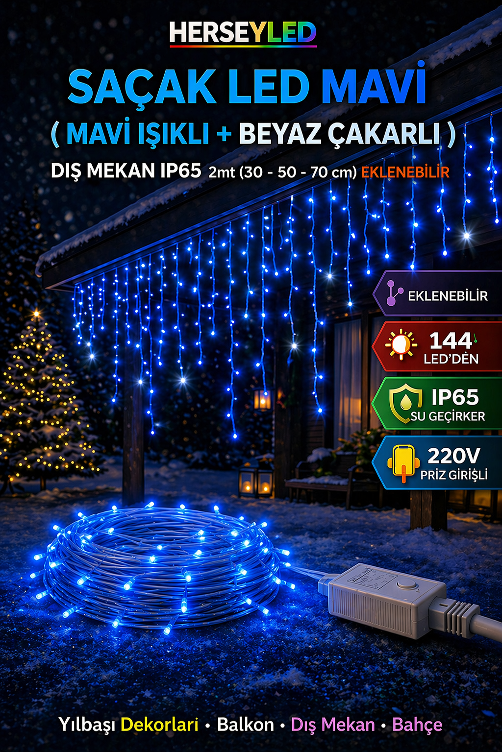SAÇAK LED MAVİ IŞIK ( BEYAZ PARILTILI ) DIŞ MEKAN IP65 2MT (30 -50-70CM) EKLENEBİLİR 144 LEDLİ BEYAZ KABLOLU YILBAŞI LED IŞIK 220V (ALS-1441MB )