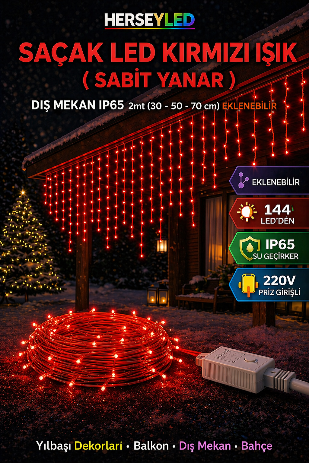 SAÇAK LED KIRMIZI IŞIK ( SABİT YANAR ) DIŞ MEKAN IP65 2MT (30 -50-70CM) EKLENEBİLİR 144 LEDLİ BEYAZ KABLOLU YILBAŞI LED IŞIK 220V (ALS-1441KS )
